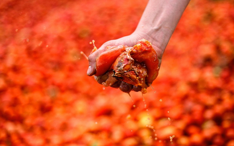 Праздник начинается ровно в 11 утра, когда с городской ратуши запускают специальную петарду. Сразу после этого на площади появляются грузовики с помидорами. Все участники битвы тут же бросаются к машинам, доверху заполненным томатами. И тут начинается настоящая «перестрелка»…
