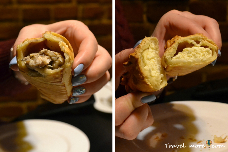 Интересно, что пирожки с разным наполнением защипывают по-разному, чтобы их было легко отличать. В мясных кибинаях мне было многовато перца, но я вообще не дружу с этой специей, поэтому могу быть необъективна. Сладкие булочки хоть и не традиционны, но зато по вкусу «огонек». Покажу вам пару пирожков в разрезе (зря что ли Надин мастер по маникюру деньги получает). Один – с курицей и грибами, другой – с творогом.