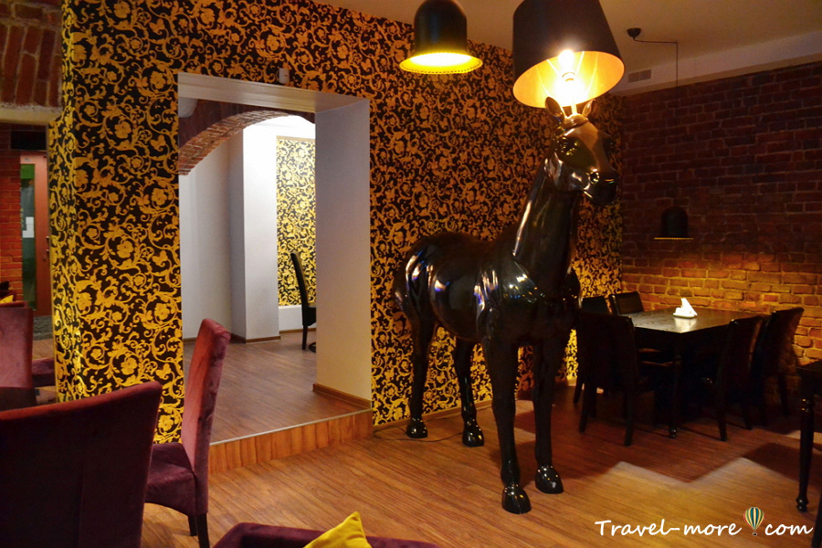 Не могу не сказать про внутренне убранство: очень уж оно внезапное и гипнотическое. Пестрые черно-желтые обои напомнили мне страничку из книги со стереокартинками. Помните такие? Скосил глаза – увидел дельфина. Или, в данном случае, лошадь. Хотя, чтобы ее увидеть, не надо ничего косить, она встречает прямо на входе, черная, полноразмерная, с торшером в голове. Кстати, тематика «с лампой вместо башни» полностью раскрыта в заведении, пострадала не только лошадь.