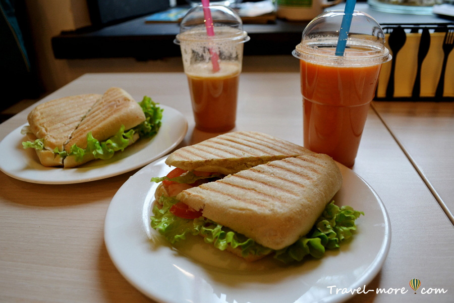Подают тут в основном бутерброды, салаты, суши, пиццы, коктейли, свежевыжатые соки и кофе. Цены на сендвичи в пределах 3 евро. Собственно, ради них мы сюда и заглянули. Не могу сказать, что они какие-то необычные или особенные, но уж точно вкусные и сытные. Кроме них порадовали меня свежевыжатые соки, которые можно составить из моркови, груши, яблока, огурца, свеклы и цитрусовых. Я выбрала морковно-грушевый фреш – получился очень веселенький цвет.