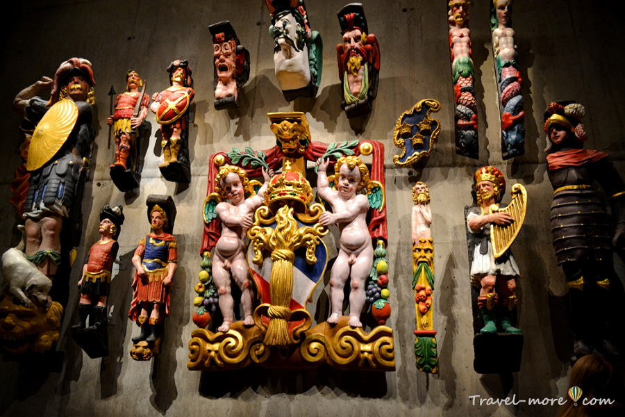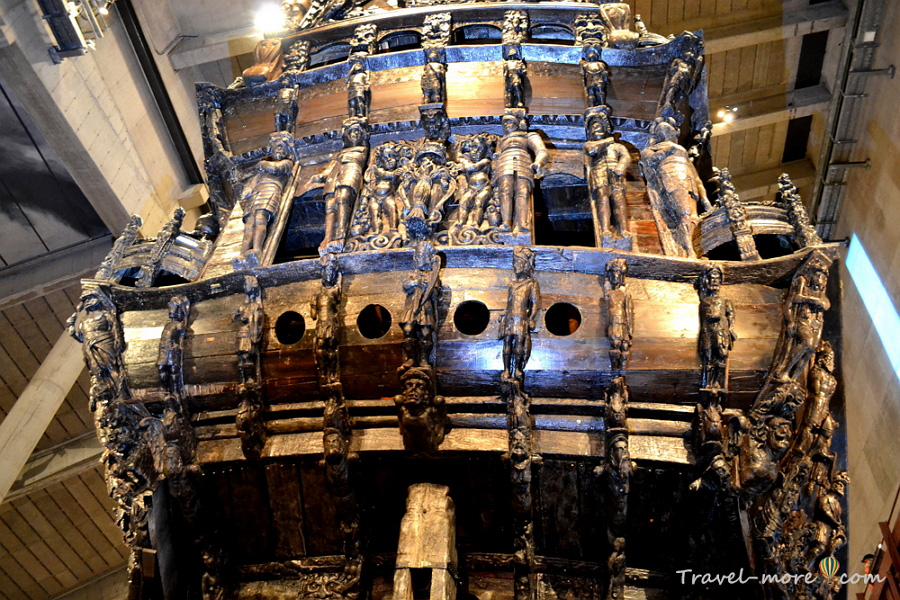 К сожалению, мои фотографии не передают всей прелести декоративной резьбы. Да и фигуры уже не так хороши, как прежде. Однако жаловаться на такое грех: попробуй сам пролежать тройку сотен лет на дне Балтики, потом говори! Чтобы защитить деревянные изваяния от разрушения, их снимали с корабля, реставрировали каждую по отдельности, а затем возвращали на свои места.