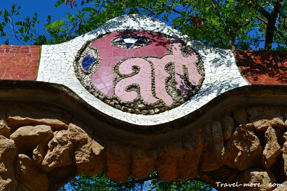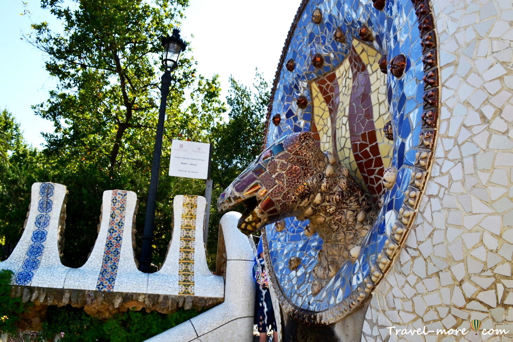 Саламандра покрыта разноцветными осколками керамики. Такая отделка встречается по всему парку. Казалось бы – оригинальная идея, а на самом деле это просто очень бюджетный вариант украшения. Поговаривают, что Гауди отправлял рабочих на ближайшую свалку собирать строительный мусор, из которого потом создавал свои шедевральные коллажи. Например, в такой же технике выполнен медальон с флагом Каталонии и головой змеи, который находится чуть выше саламандры.