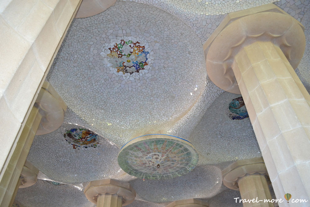 Отдельного внимания заслуживает потолок, полностью украшенный керамической мозаикой. В нем находится скрытая система ливневой канализации, которая позволяла снабжать парк водой: трубы проходят внутри колонн.