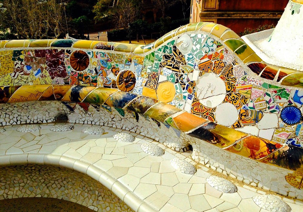 Эта же техника применялась и при создании изогнутой скамейки Жужоля. Создавая декор скамьи, Гауди сотрудничал со своим учеником Жузепом Жужолем, поэтому у лавки такое название. Она находится как раз над залом с колоннами и обрамляет собой огромную смотровую площадку. Скамья знаменита своей длиной – 302 метра. Поэтому здесь всегда найдется место для туристов, желающих передохнуть после подъема в гору. Только будьте осторожны, в жаркую погоду на черепках строительного мусора можно поджарить свою нежную «мадам сижу».