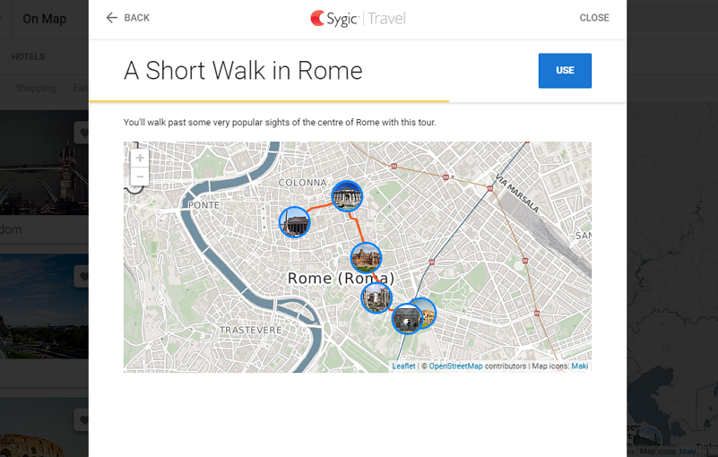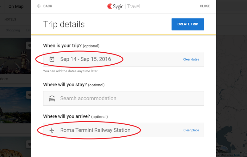 Вот такой стандартный маршрут по Риму выдает Tripomatic.com. Нажимаем кнопку USE и попробуем внести в него свои коррективы. Нам предлагается ввести даты поездки, адрес отеля и место прибытия (аэропорт, ЖД вокзал или автостанция). Если какой-то из пунктов вам не известен, его можно не указывать. Мы знаем, что хотим побывать в Риме с 14 по 15 сентября. Прибывать будем на железнодорожный вокзал. CREATE TRIP.