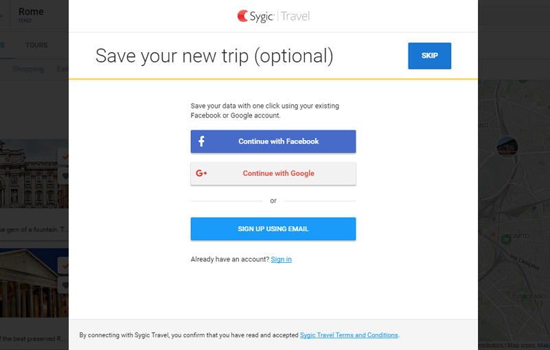 Если у вас еще нет аккаунта, система предложит его создать или авторизироваться через социальную сеть или почту. Опять же, если вам не нужно сохранять план путешествия, эту часть можно «скипнуть». Что мы и сделали.