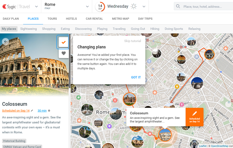 Далее можно добавлять в маршрут дополнительные достопримечательности или наоборот, убирать те памятники культуры, которые вам не слишком интересны. Также позволяется изменять даты поездки и планировать посещение тех или иных объектов на разные дни.