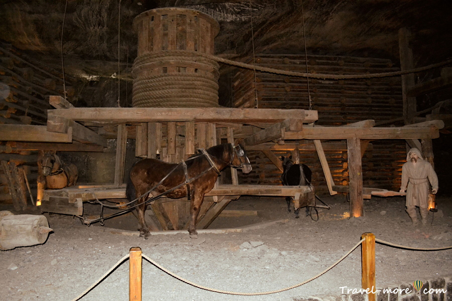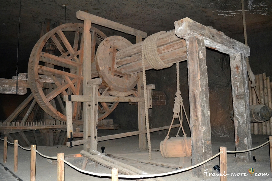 Кроме него в этом «музейном зале» находятся экспонаты, которые рассказывают о процессе транспортировки соли. Многие века между ярусами шахты ее перемещали сами горняки. Массивные глыбы соли выдалбливали в виде «болванок», которые можно было катить. Более мелкие куски и бочки перетаскивали с помощью специальных санок. В 17-м веке придумали укладывать на землю буковые доски, что упростило процесс доставки соли к поверхности.