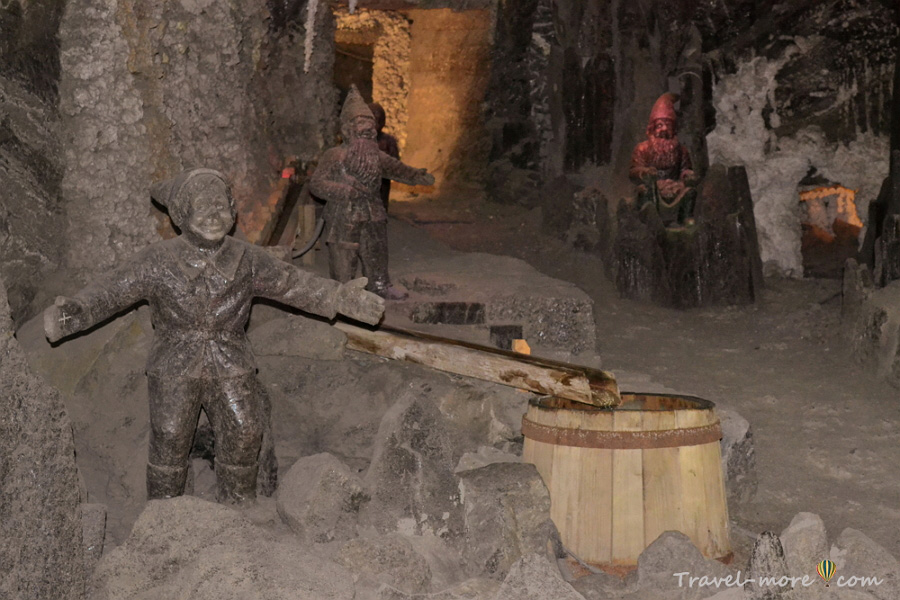 Чтобы детям было нескучно на маршруте, для них создали экспозицию с гномами. Маленькие человечки якобы охраняли когда-то соляные сокровища и помогали горнякам в работе. Мастер, который их вырезал, придумал для каждого свою шахтерскую специальность.