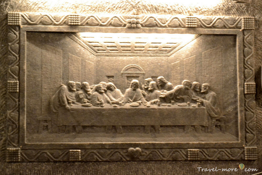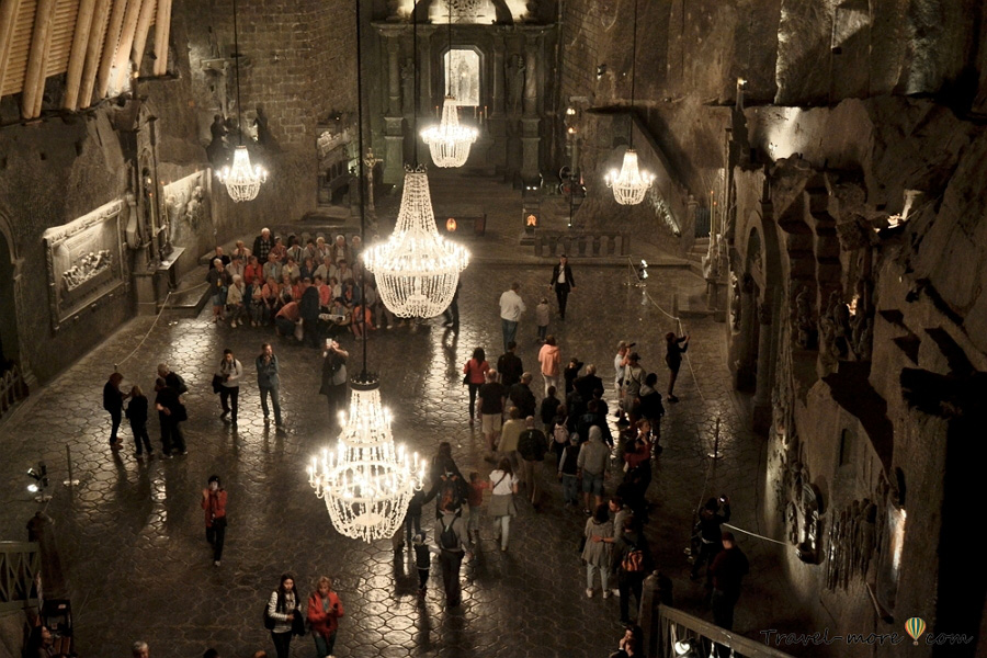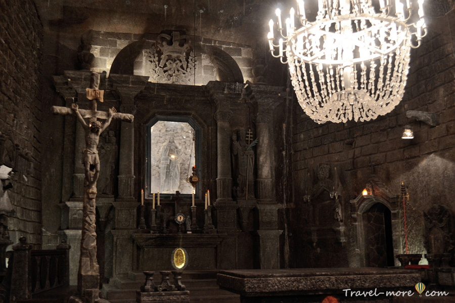 Самое впечатляющее место на маршруте – часовня Святой Кинги. Эту камеру выдолбили в огромной глыбе зеленой соли. Для подземной пещеры у нее какие-то нереальные размеры. К тому же, на глубине 100 метров никак не ожидаешь увидеть церковное помещение, залитое светом как будто левитирующих люстр.