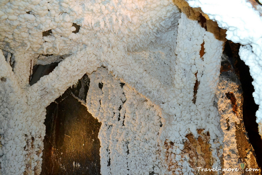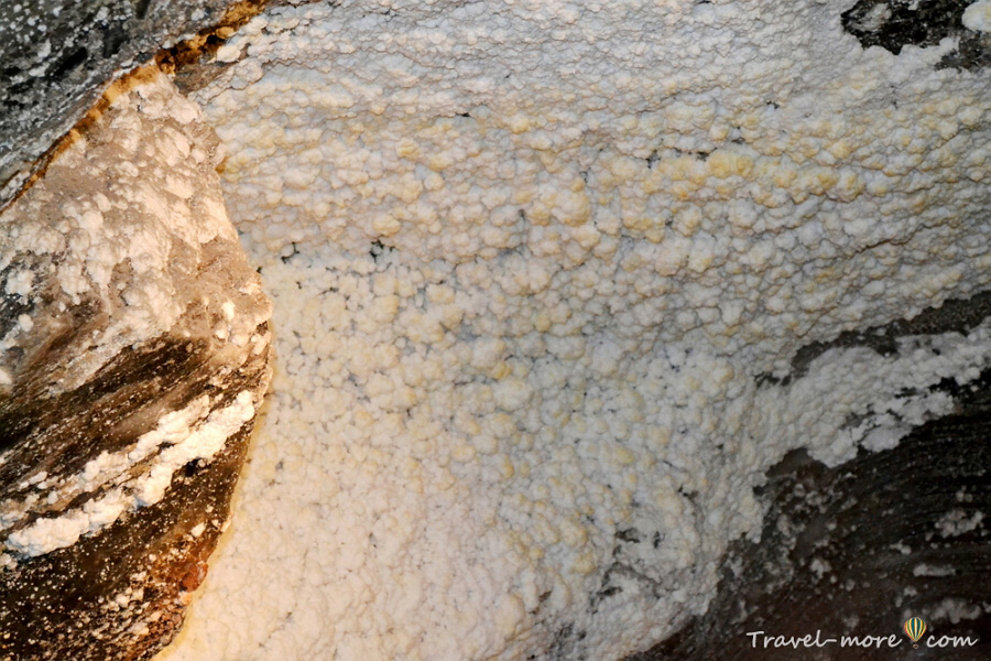 В некоторых камерах она еще и «растет». На стенах и потолке можно увидеть наросты, похожие на затвердевшую мыльную пену – это результат повторной кристаллизации.