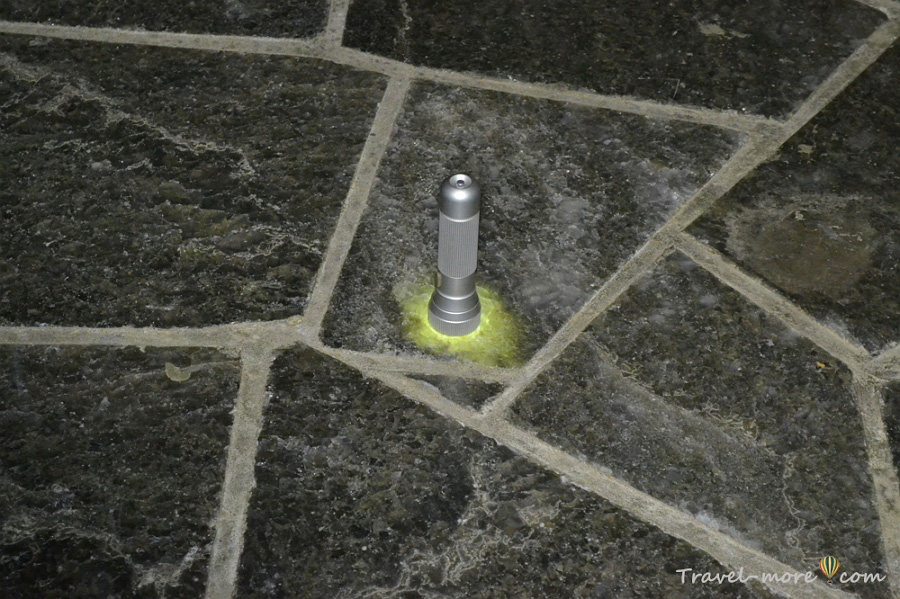 Когда ходишь по гладкому и аккуратно отполированному полу выработки, никогда не подумаешь, что из соли сделана не только статуя. Каменные плиты под ногами тоже выточены из солевых глыб. Для тех, кто не верит, экскурсовод проводит маленький эксперимент: ставит на пол фонарик. Свет его не тухнет, а рассеивается в глубине полупрозрачного камня.