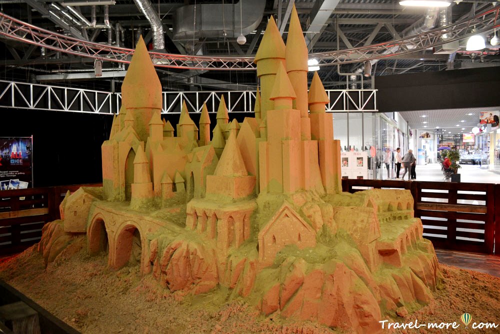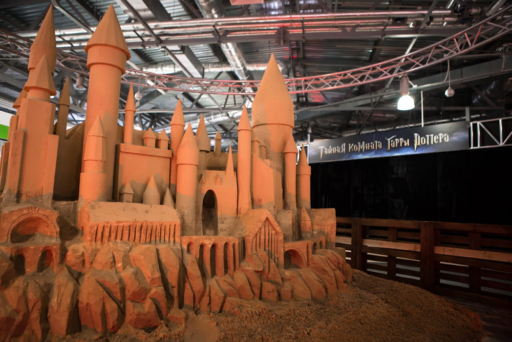 Найти выставку в торговом центре несложно – достаточно ориентироваться на огромный макет замка «Хогвартс», построенный из песка. Только представьте, на его возведение ушло 35 тонн сыпучего стройматериала.